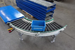 Wij hebben zowel gebruikte als nieuwe niet aangedreven rollenbaanbochten in voorraad. De rollen kunnen conisch zijn. Daarnaast maken wij gebruik van gedeelde rollen. Hierbij draait de buitenste rol sneller dan de binnenste rol. Als de bocht iets schuin opgesteld wordt, helpt de zwaartekracht de producten in beweging.