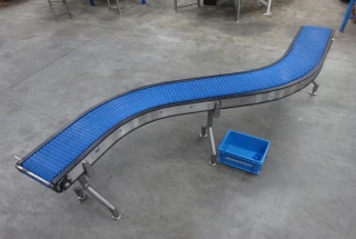 Schakelbanden zijn er in rechte banden en radius banden. Beide variaties hebben wij ruim in voorraad. Een rechte schakelband wordt gebruikt voor het lineair transporteren van goederen. Een radius schakelband is vooral geschikt in situaties waar een transportband flexibel moet kunnen buigen of draaien in een bepaalde radius (vaak gebruikt in bochten van 30°, 45°, 90°, of zelfs 180°), terwijl deze tegelijkertijd een stabiel transportoppervlak biedt. Dit type schakelband is ideaal voor toepassingen waarbij goederen in bochten moeten worden geleid, bijvoorbeeld in krappe ruimtes of complexe transporttrajecten.
